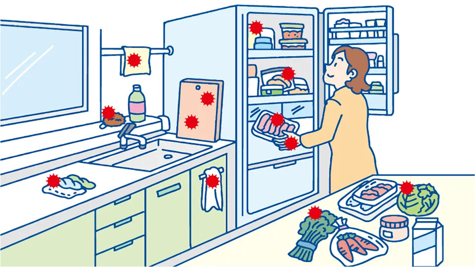 細菌もウイルスも目には見えない小さなものです。細菌は温度や湿度などの条件がそろうと食べ物の中で増殖し、その食べ物を食べることにより食中毒を引き起こします。一方、ウイルスは、細菌のように食べ物の中では増殖しませんが、食べ物を通じて体内に入ると、人の腸管内で増殖し、食中毒を引き起こします。また、ウイルスは低温や乾燥した環境中で長く生存します。